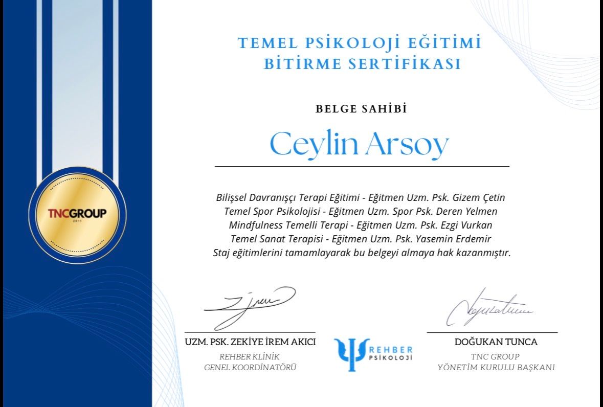 Ben Psikolog, Aile Danışmanı ve Çocuk Gelişim Uzmanı Ceylin Arsoy. Mesleki çalışmalarımda ağırlıklı olarak yetişkin bireylerle bireysel danışmanlık süreçleri yürütmekteyim. Çalışma alanlarım; değersizlik hissi, bağlanma ve ilişki problemleri, iletişim güçlükleri, tükenmişlik ve varoluşsal sorgulamalar etrafında yoğunlaşmaktadır.